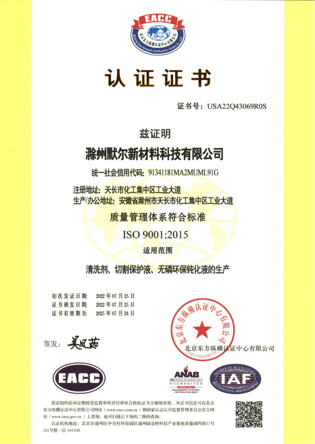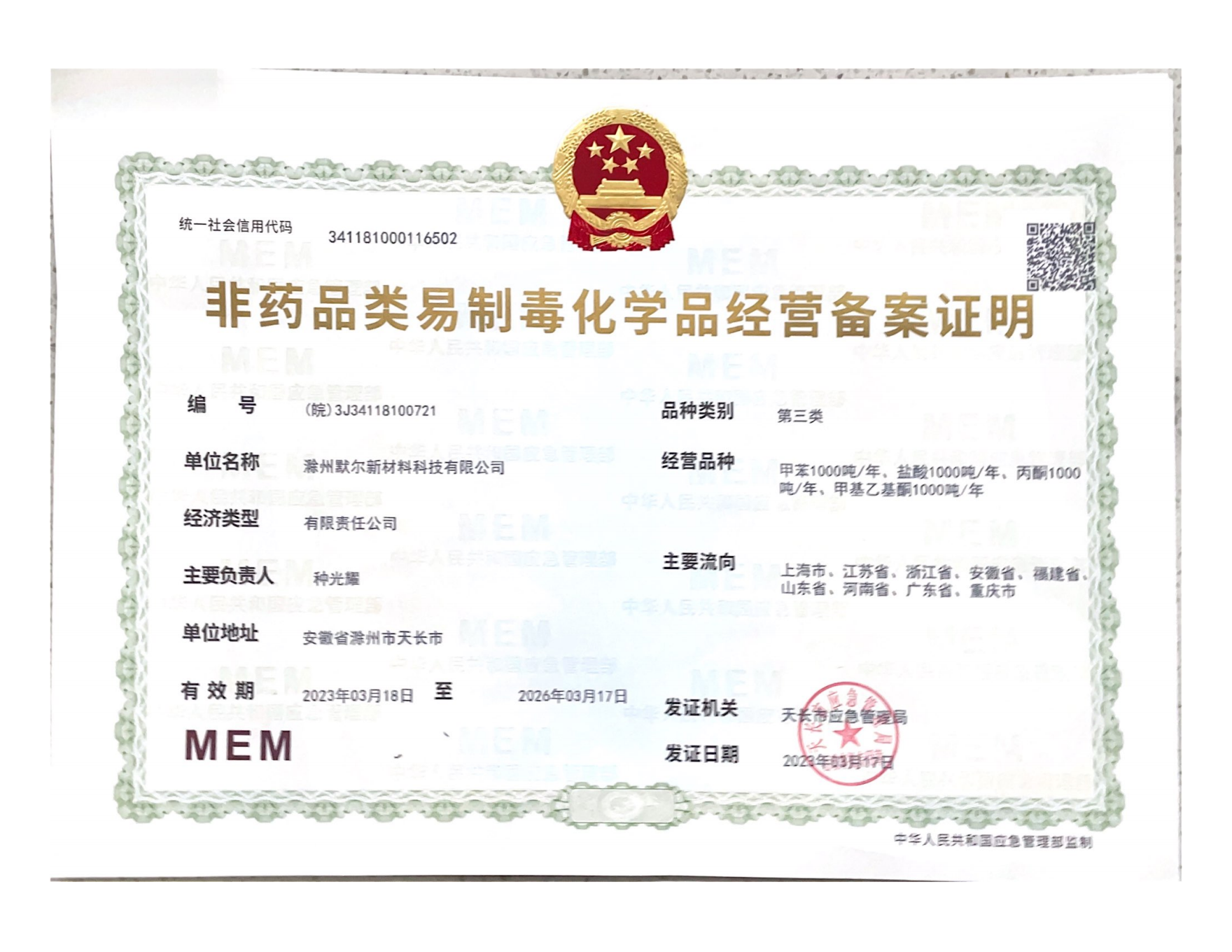 滁州默尔新材料科技有限公司,成立于2016年,位于滁州天长市铜城镇精细化工园区,工厂占地110亩,是一家致力于纳米材料、精细化学品等领域的研发、生产、销售于一体的科技型企业。企业通过了ISO9001质量管理体系认证,ISO14001环境管理体系认证,ISO45001职业健康安全管理体系认证。